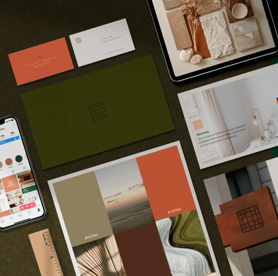 Esse branding traduz a essência da arquiteta Fernanda Mignone em uma identidade visual elegante, natural e atemporal. A paleta de cores, inspirada em elementos da natureza e materiais autênticos, reflete a busca por aconchego e sofisticação em cada projeto. O símbolo central, com formas geométricas delicadas, remete à harmonia e ao equilíbrio presentes na arquitetura e no design de interiores. O resultado é uma marca que une sofisticação estética e propósito: comunicar a visão de uma arquitetura que valoriza a beleza, o conforto e a vida em ritmo mais humano.