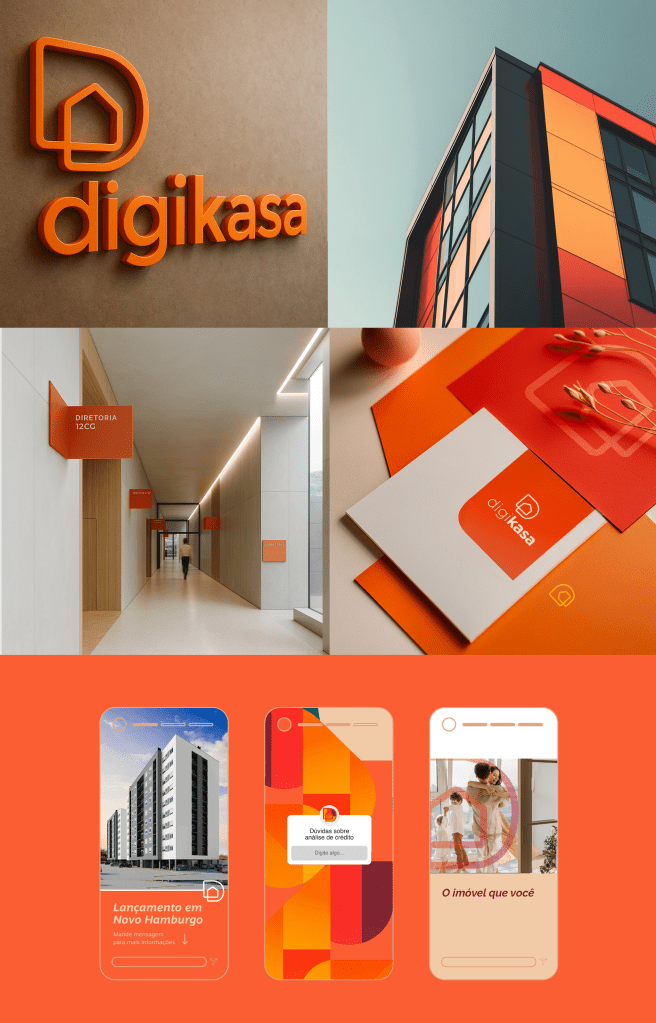 No projeto de branding da Digikasa, traduzimos tecnologia e habitação em uma identidade moderna, versátil e memorável. Cores quentes que transmitem proximidade e confiança, com contrastes que reforçam inovação e digitalidade. Tipografia e símbolo com formas fluidas e arquitetônicas, que unem o digital e o espaço físico. Do ambiente corporativo à comunicação impressa, cada detalhe reforça a essência da marca — ser acessível, confiável e contemporânea. O resultado é uma marca sólida, que conecta propósito e estética para transformar a experiência de morar e investir.